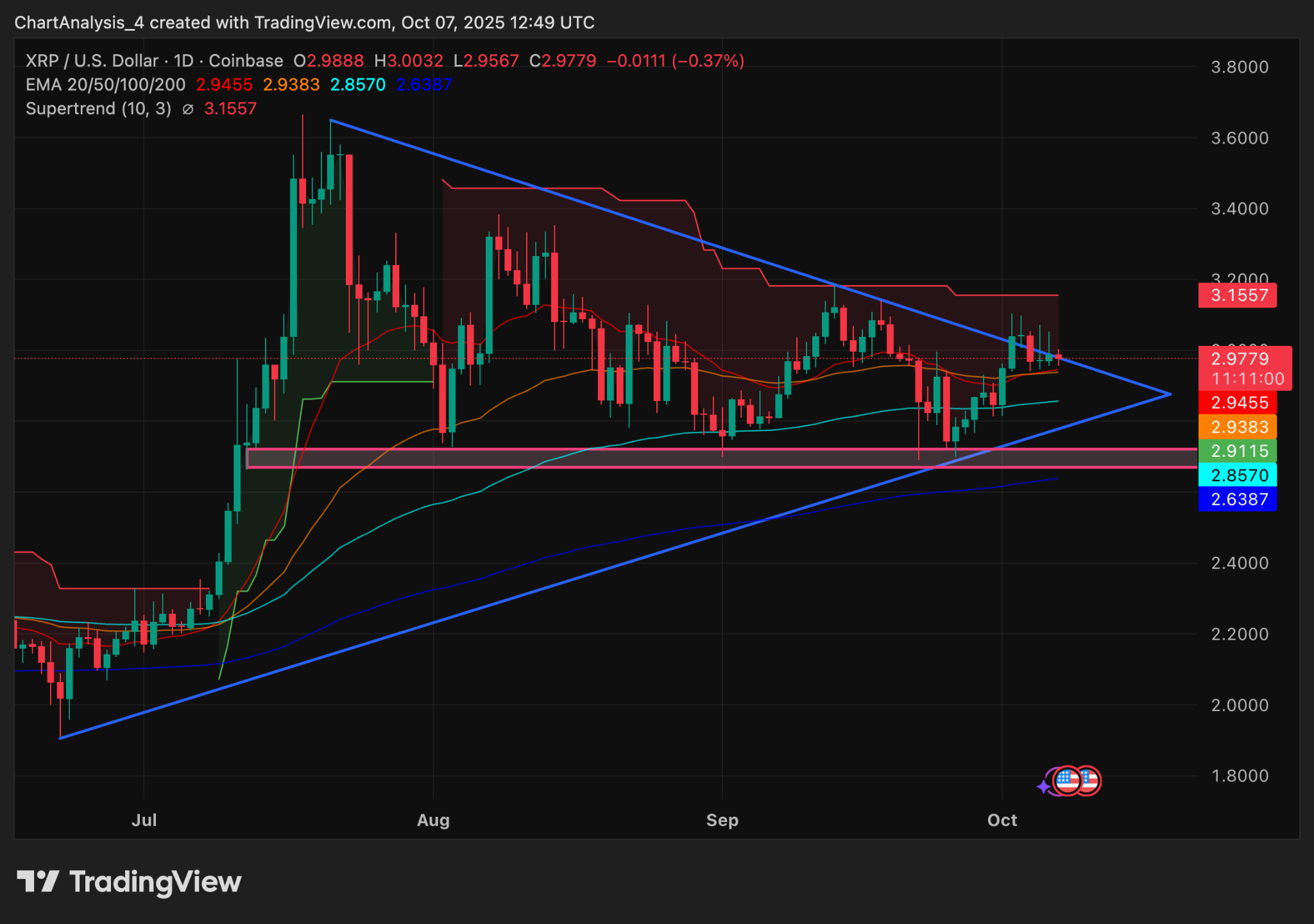 Long-term support is the 200-day EMA of $2.63 and the 20-day EMA of $2.94 remains a significant pivot. XRP can gain momentum quite prominently in case the coin is able to stay above the mark of $2.85. A fall below that would render the bullish setup weak. According to market observers, the compression that XRP is experiencing is similar to the silence that came before its previous rallies, meaning that there might be a more pronounced direction change in prospect.