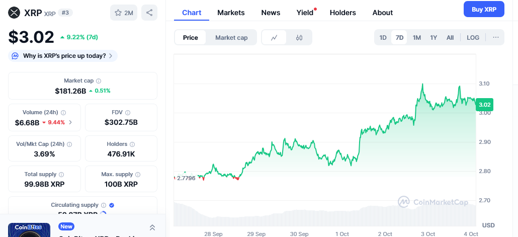 Ripple holders are jubilant over the token’s recent price recovery. Following Bitcoin’s return to $123,000, XRP has recovered, undoing its late September losses. As of October 4, XRP’s value stood at $3.02 following a 5.85% jump over the past month. The 7-day XRP price chart also shows a 9.43% jump.