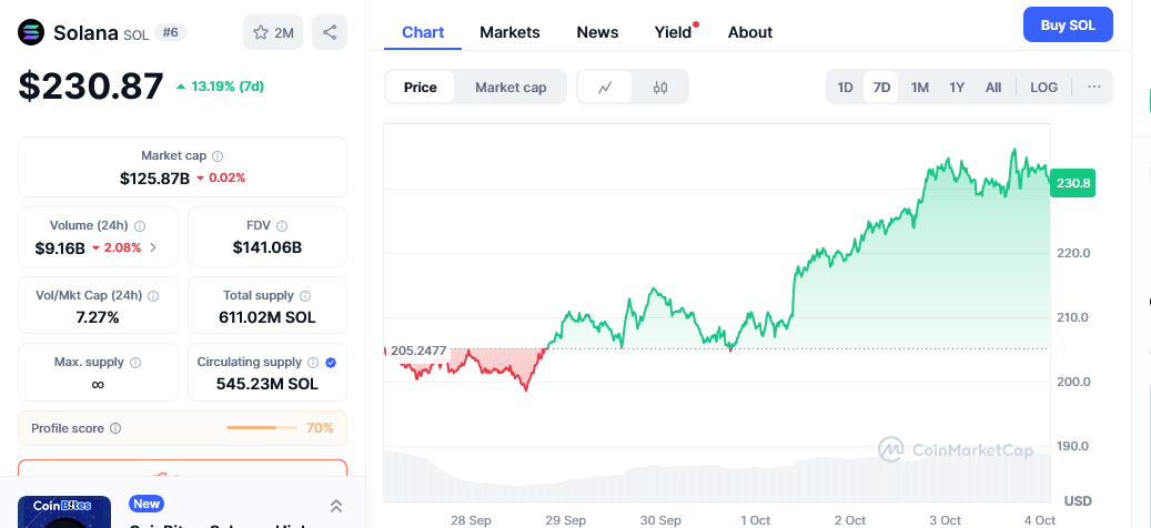 As of October 3, Solana was trading at $232.32 following a 16.11% jump over the past week. The 30-day Cadano price chart also shows a 10.07% jump.