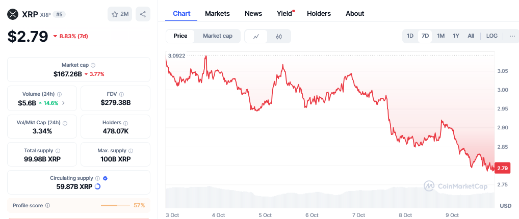 However, XRP has not surged as expected. As of October 9, XRP’s value stands at $2.83 following a 5.91% drop over the past 30 days. The 7-day XRP price chart shows a 5.12% drop.