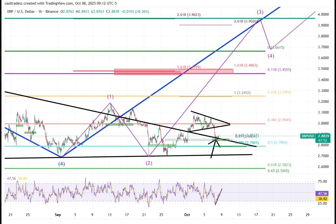 If XRP manages to close daily candles above $2.89, short-term traders expect a bullish continuation pattern forming toward $3.15, then $3.65. A breakout above $3.30 could ignite an impulsive wave toward $6, a move supported by network activity.