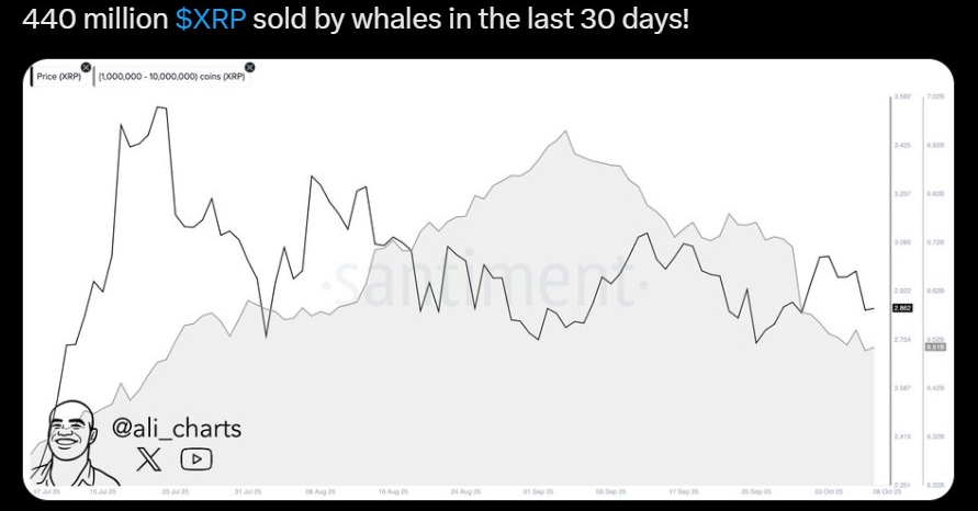 XRP whale activity skyrocketed over the past month, showing a 1,000% increase in large transactions exceeding $500,000. Data from Santiment reveals that whales are not only accumulating but also redistributing holdings to optimize entry zones. The number of high-value transfers jumped from less than 200 daily in early September to over 2,000 by early October, signaling renewed on-chain confidence.