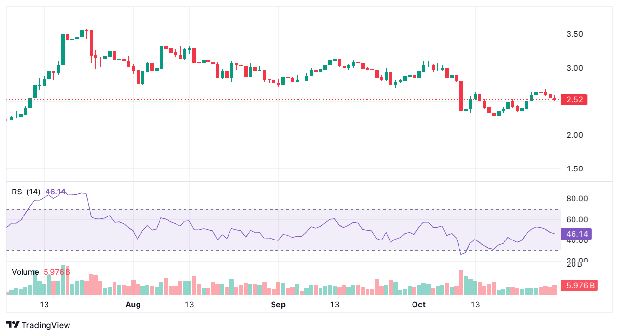 The RSI hovering near 46 suggests a neutral market approach with traders unsure which way to lean next. For now, support sits near $2.00, while the $3.00–$3.20 zone remains a tough ceiling that XRP must break to reignite any real bullish momentum.