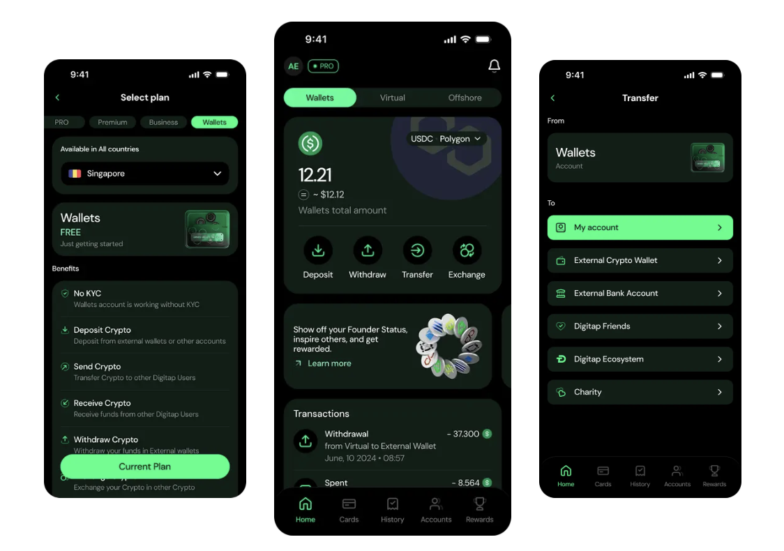 Digitap is a next-generation digital banking platform that blends traditional finance with crypto functionality. Users can hold both fiat and digital assets, send cross-border payments, and spend crypto anywhere using the Visa card through a single app.
