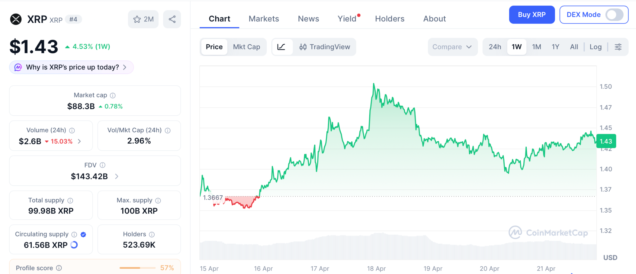Ripple (XRP) trades at $1.43 on April 21, down about 62% from its $3.65 July 2025 peak and 3% below the $1.50 level it briefly touched on April 17, per CoinMarketCap. The xrp price prediction hinges on holding $1.43 and clearing $1.45 to open the run back to $2.00.