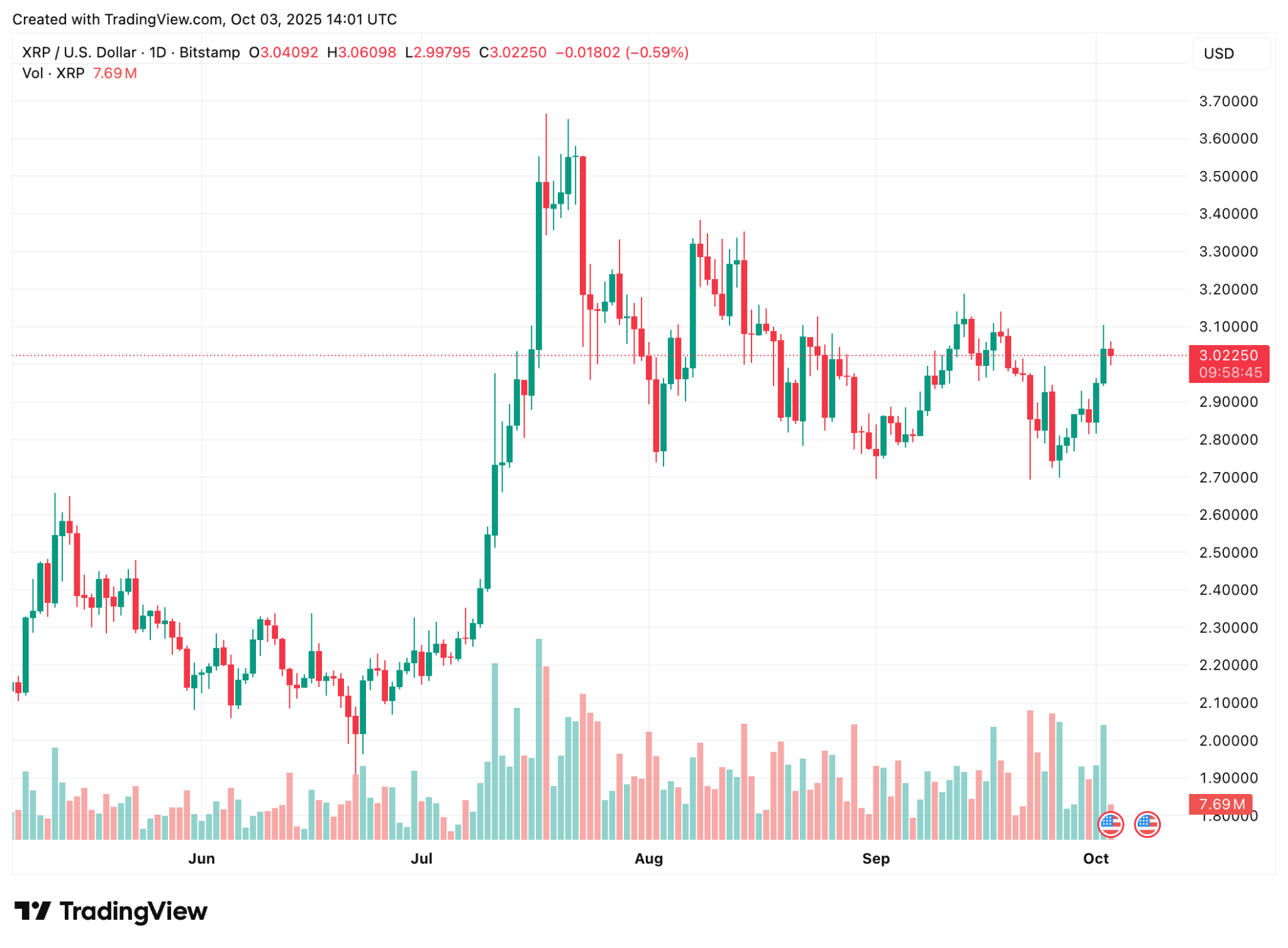 XRP price is currently $3.02. The token’s market capitalization stands at $181.8 billion, with a 24-hour trading volume exceeding $6.1 billion. XRP has surged nearly 10% this week, boosted by bullish sentiment following a treasury announcement made on October 1.
