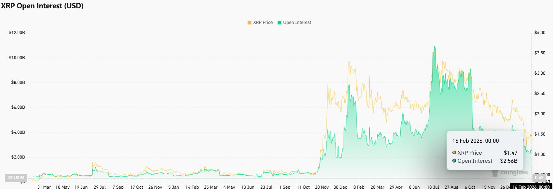 The token has fallen 25% so far in 2026. XRP dropped from above $2.40 in early January to a low near $1.15 on February 11. This marks a 52% correction from its $3.56 all-time high.
