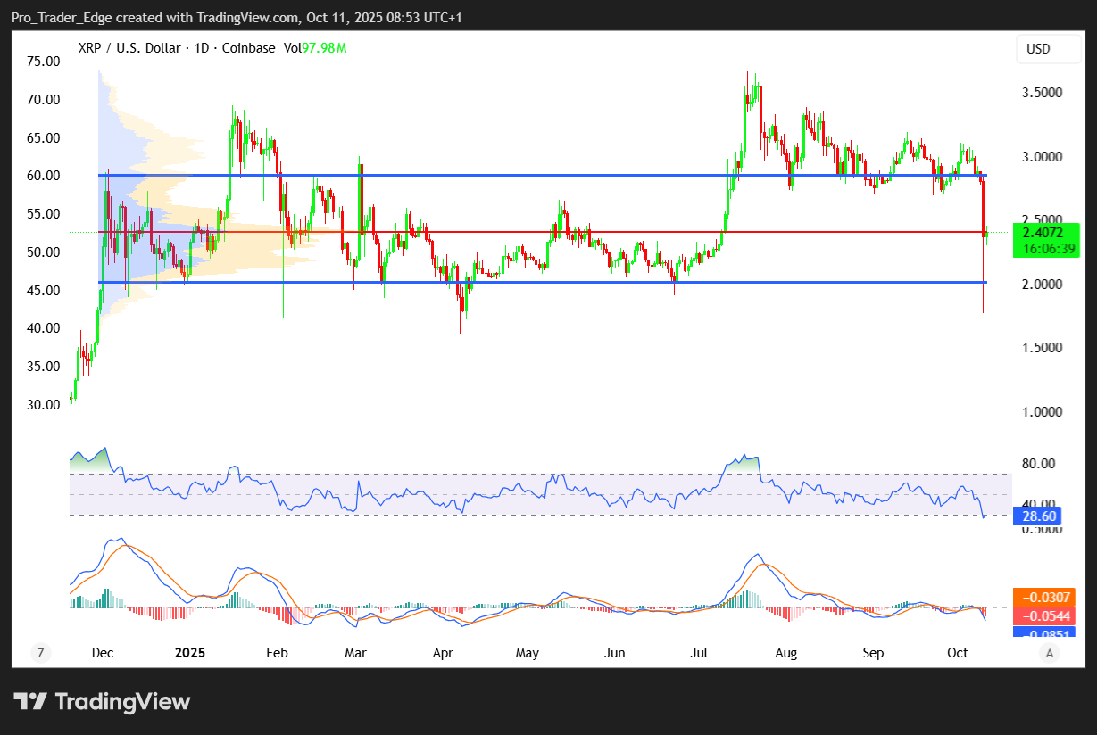 - XRP crashed up to 42% on Friday, dropping from $2.82 to as low as $1.64 before recovering to $2.36